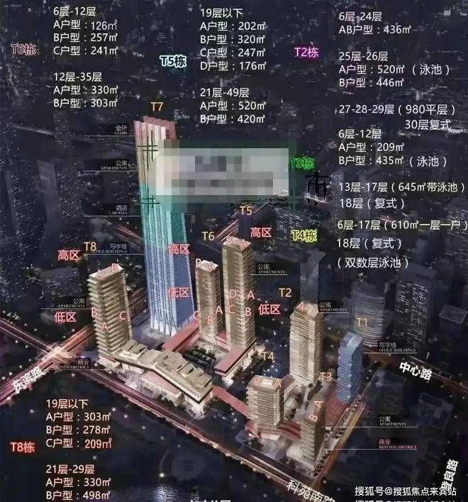 南区分为:T5、T6、T8公寓,T7为环球商务中心。