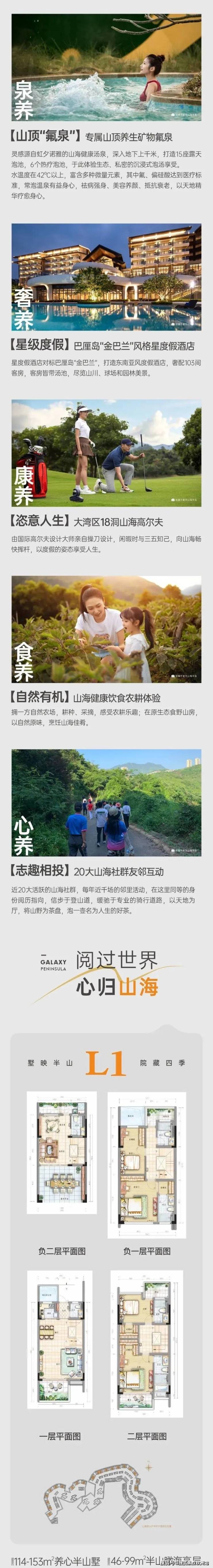 星河山海半岛别墅背倚绵延青山,面向无垠大海,坐拥山、林、湖、海、谷、高尔夫及汤泉等稀缺资源,尽享巽寮湾11公里绝美海岸线 。在这里,山的沉稳与海的灵动相互交融,构成了一幅如诗如画的自然景观。清晨,被轻柔的海浪声唤醒,推开窗,清新的海风裹挟着淡淡的海腥味扑面而来,眼前是一望无际的湛蓝大海,波光粼粼,让人心旷神怡;傍晚,漫步在沙滩上,欣赏着落日余晖将天空和海面染成橙红色,仿佛整个世界都被这温暖的色调所笼罩,惬意而美好。