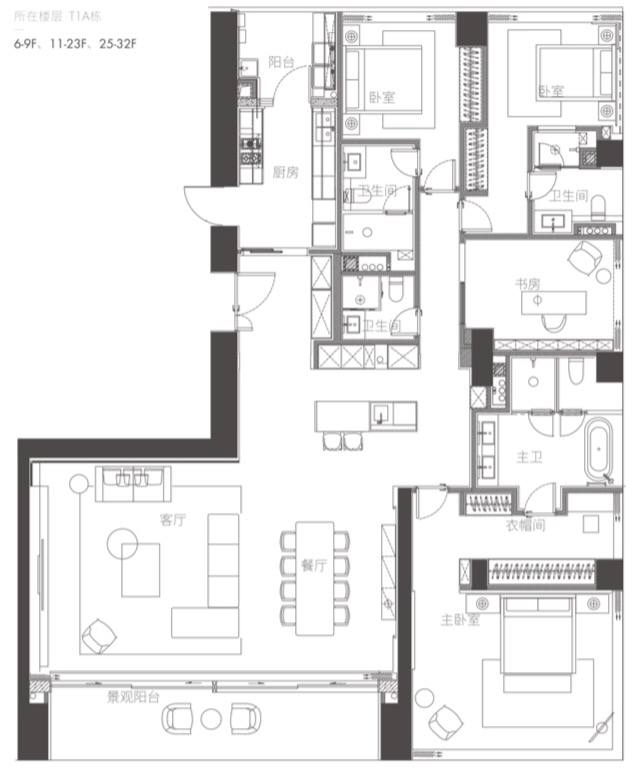 01户型 西端户 约350㎡ 四房两厅四卫