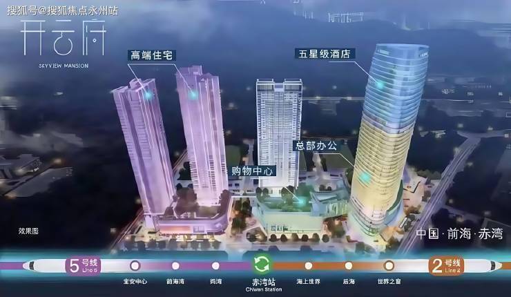 赤湾先发山海都会超体:3.2平方公里赤湾先发·城市双地铁综合体,集高端住宅、购物中心、总部办公、五星级酒店等复合业态于一体,筑就赤湾地标,焕新山海生活。