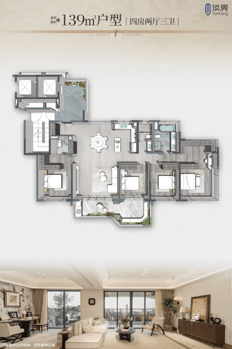 以下为香山颂约139㎡的高能应用,实用率至高130%(不含电梯厅)。