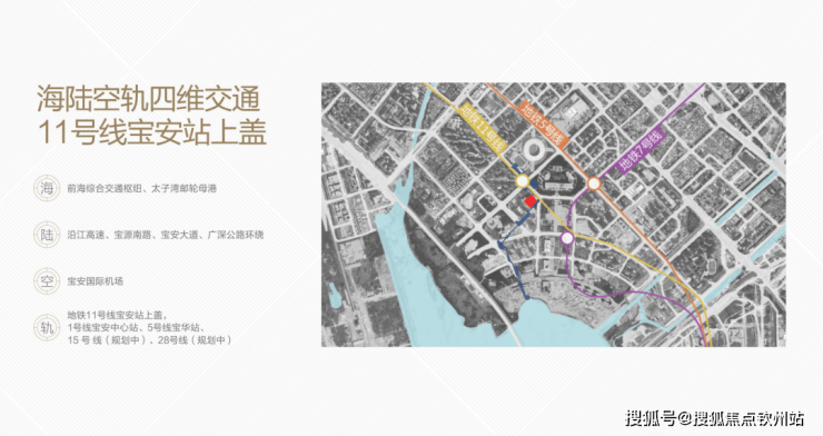交通:项目为11号线宝安站上盖,周边汇聚了3地铁+3高速+4港口+国际机场。