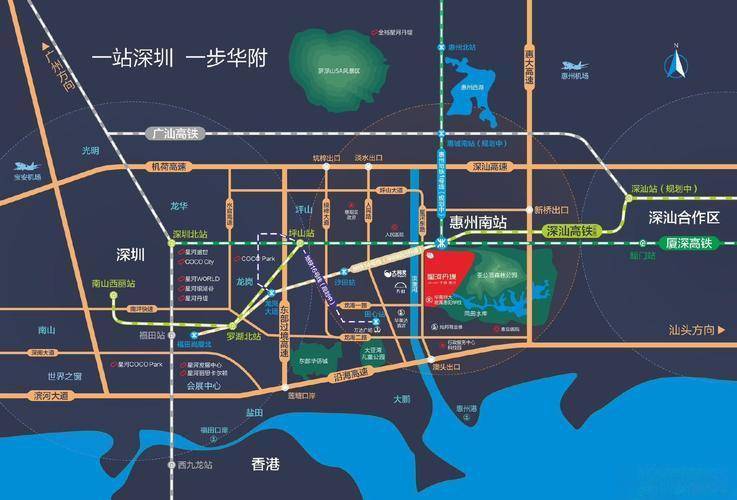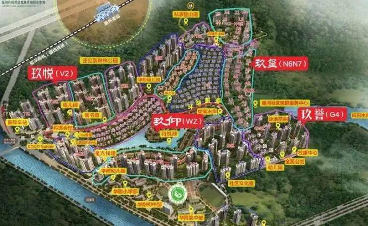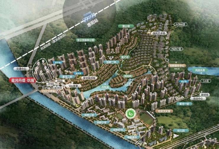 惠州星河丹堤位于惠阳区亚公顶森林公园旁,紧邻厦深高铁惠州南站,占据了粤港澳大湾区腹地中心的优越位置 。项目总占地约150万㎡,总建筑面积约260万㎡,规模宏大,是星河集团在惠州的开山之作。整体分多期开发,预计开发周期8 - 10年左右,产品类型丰富,涵盖别墅、洋房、高层等多种住宅形式,满足不同人群的居住需求。