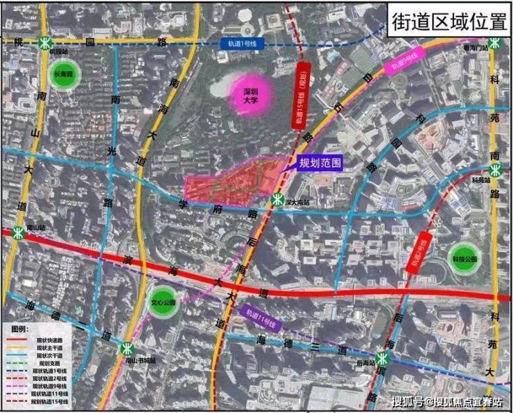 项目位于南山区粤海街道白石路与学府路交叉口西北侧,东临白石路,西近南海大道,南临学府路,北面与深圳大学毗邻。周边集聚了腾讯滨海大厦、软件产业基地等写字楼,地理位置优越。