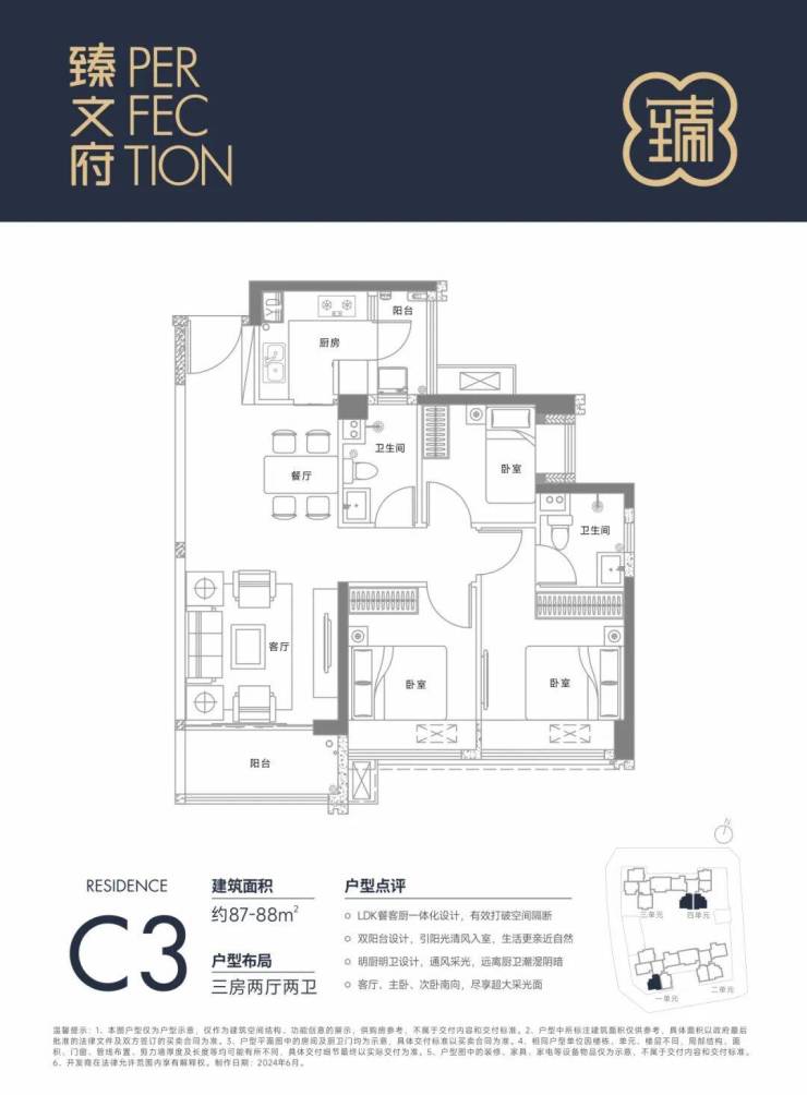 87㎡的3房2厅2卫,设计的是经典竖厅格局,进门入户玄关,LDKB一体化设计,三开间朝南,L型厨房还带1个小生活阳台,卫生间干湿分离,得房率约85%(包含赠送),阳台朝东南向。