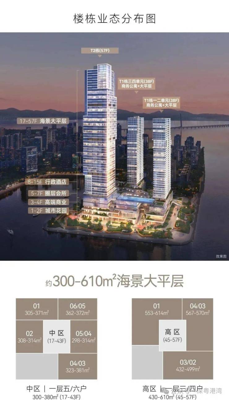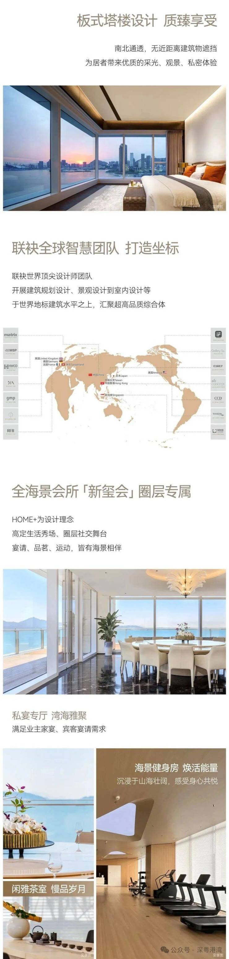 内部配套:配备高端私密会所、约 766 平方米的深圳首个悬空无边际海景泳池、首层城市花园、健身房、儿童游乐区以及 1800 平方米的海洋博物馆等设施。