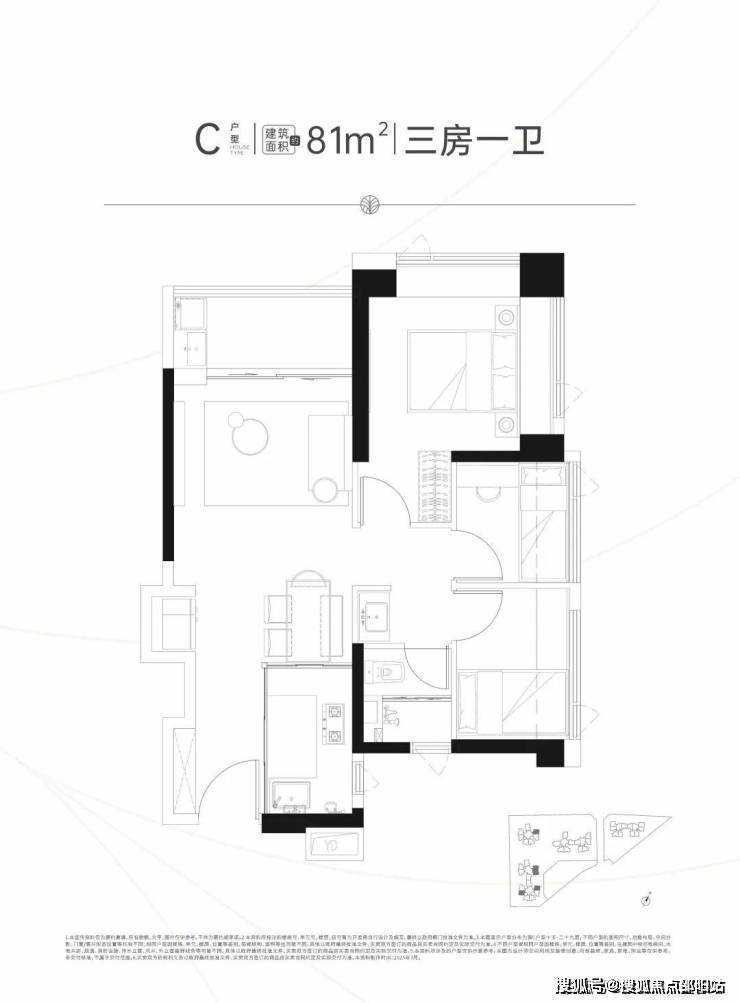 春和府首推两种主力户型:81㎡三房一卫:方正实用,竖厅格局,三段式卫生间,西南朝向,采光充足。