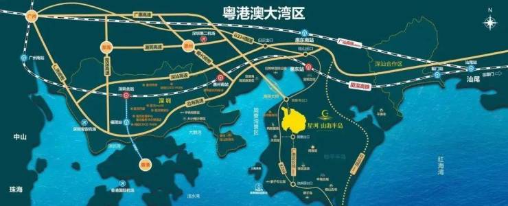 星河山海半岛,位于巽寮旅游度假区门户位置,享有“四高速、一高铁、一机场”三维立体交通网,项目距离高速出口仅6KM,厦深高铁惠东站距离深圳北站仅40分钟车程;未来将规划广惠高速延长线,项目内设有高速出口;另有在建的广汕高铁,深圳第二机场(惠州平潭机场)以及规划中的海上航线,未来将实现海、陆、空全线打通,轻松享受深广1.5小时黄金度假圈生活。