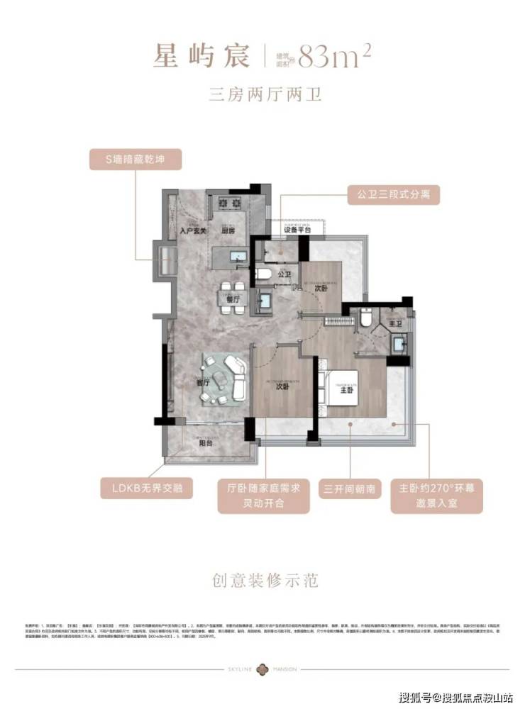 83㎡的3房2厅2卫,设计的是经典竖厅格局,客厅3.35米开间,LDKB一体化,S墙设计预留双开门冰箱卡槽位,三开间朝南,动静分区,分别做到了主卧16.02㎡/次卧9.08㎡/次卧7.01㎡(包含墙体飘窗),U型厨房,公卫三段式干湿分离,赠送1.98平设备平台,得房率约77.9%(不含赠送),套内面积64.28㎡,阳台5.02m²西南或东南朝向。靓点:83平做到了3房2卫,主卧270°无柱转角飘窗,厨房烟道外置+额外赠送设备平台,并且是纯南向格局。