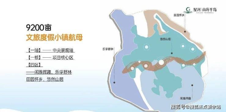 星河山海半岛总占地约9200亩,其中1500亩建设用地,7700亩配套设施用地。项目总规划配套按照分区空间规划划分,可分为【一轴】——中央景观轴,【一核】——项目核心区,【四区】——闲雅挥趣、乐学野林、田园怀乡、悠然山居。