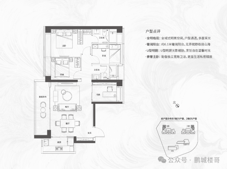 【124㎡的4房2厅2卫】1栋01/2栋05户型,电梯入户送独立公区,横厅南北通透格局,客餐厅6.1米开间,LDKB一体化设计,五开间朝南,主卧大套间设计,6.1米长观景大阳台,U型厨房,公卫三段式分离,得房率:72.07%(不含赠送)西北或东南朝向;
