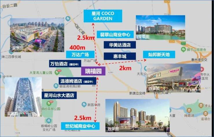 商业配套:万达广场(直线距离项目约300m)、益田 Holiday Park(直线距离项目约800m)、灿邦新天地(直线距离项目约2km);温德姆酒店(建设中)、万怡酒店(建设中)、华美达酒店(直线距离项目约900m)等。