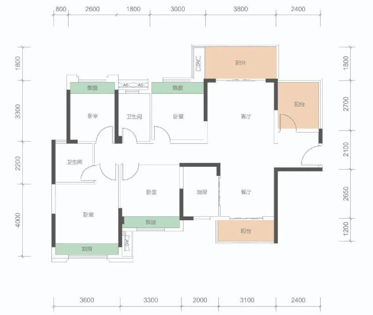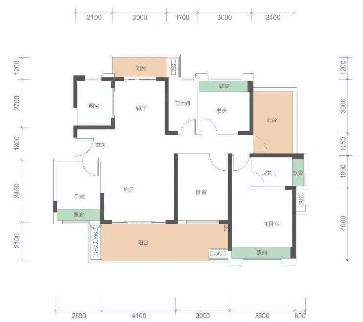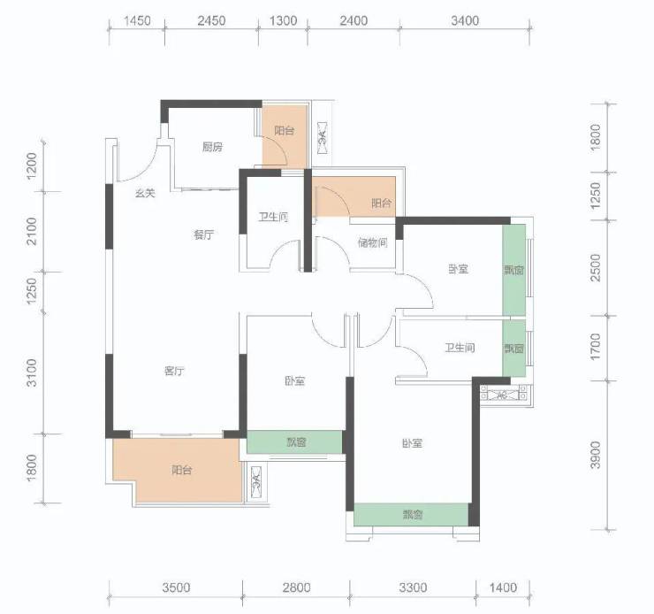 B户型: 100㎡(3+1房,2卫)同级面积稀缺3+1房、稀缺三开间朝南