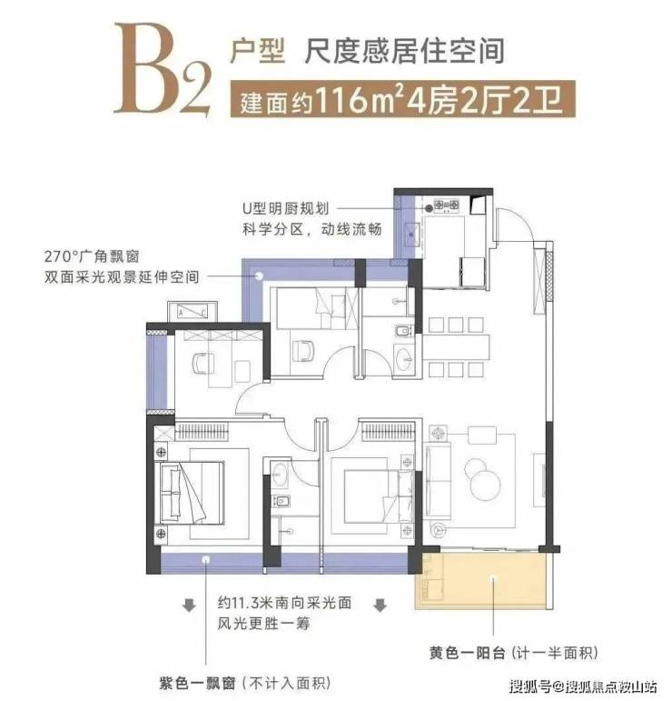 建面约116㎡竖厅4房2厅2卫,非常理想的4个房间的布局,4开间朝南向。几乎每个房间都是满开间的飘窗增加使用率,次卧还可以做270度的一个转角飘窗,实现双面采光,主要就是配置了一个多功能的套房设计,居住更舒适。