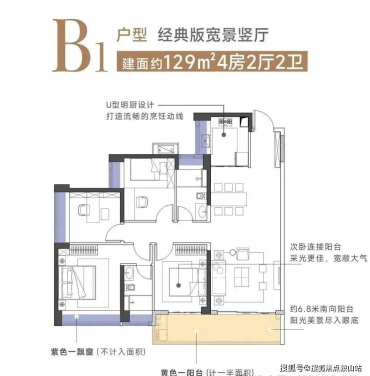 建面约129㎡竖厅4房2厅2卫,尺度进一步放大,一体化餐客厅让空间观感更通透,从约6.8米宽景阳台向外望去,可无遮挡看园林景观。阳台直通一间卧室,美景就在床边。主卧配置一个大飘窗,将采光和景观面放大。
