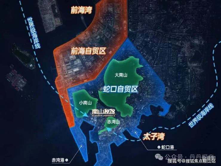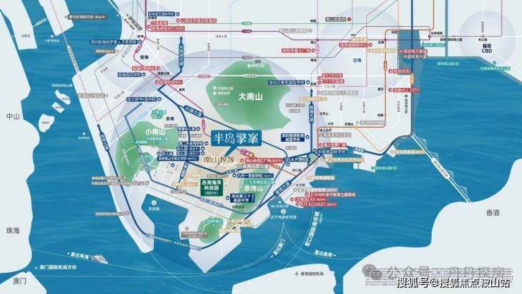 【约3.2平方公里 世界海洋科技创新先导区】在大的蓝图下,中国南山以同步世界湾区的规划理念,打造“前港-中园-后城”的城市格局。并依托3山1海的资源禀赋优势,以“两环、三心、三轴、六大街区组团”的蓝图规划,打造屹立深圳湾区的世界半岛生活。