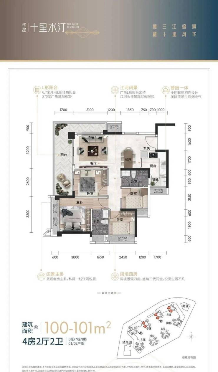 项目户型覆盖77-119㎡三至四房。南向三开间的人性化设计,南北通透双阳台,兼顾景观与生活;更有区域唯一L形阳台奢宅大户,6.6+4.4的奢阔尺度,构建出270°IMAX级广角江景生活。