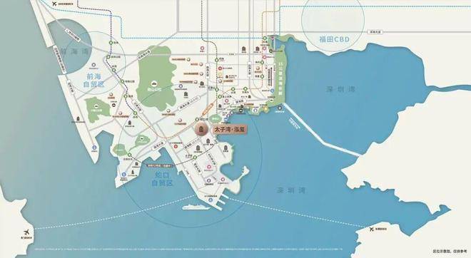 交通网络极为发达:项目为双地铁上盖(2号线蛇口港站、12号线太子湾站),3站可达前海、7站至后海。毗邻22万吨级蛇口邮轮母港,可快速直达香港、澳门及国际航线。微波山隧道已通车,10分钟直达前海,望海路快速路也在规划建设中。