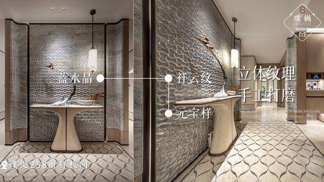 你还会忍不住去摸一摸,背景墙上的祥云纹凹凸纹理形成了一道道水波纹,形状是「元宝」,是财富到家的寓意。