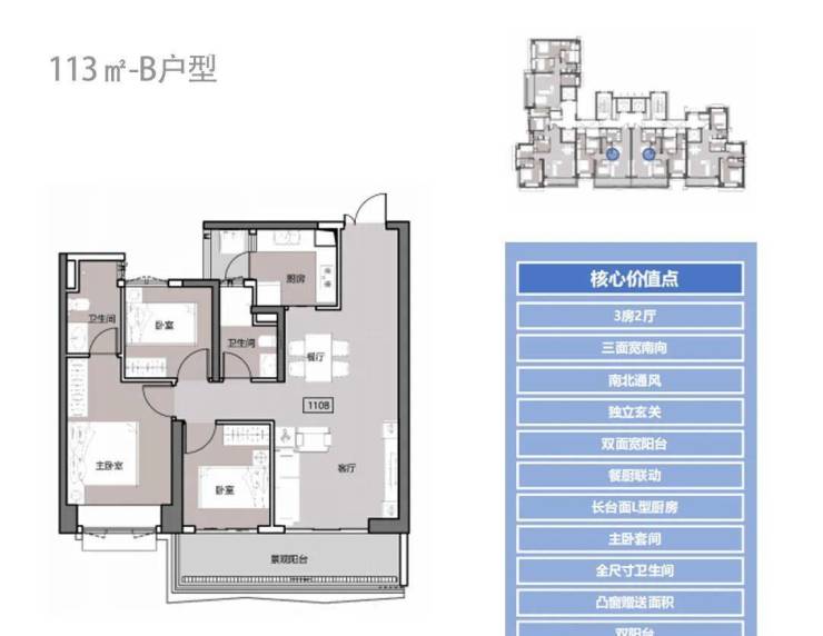 113㎡的3房2卫户型,采用经典的LDKB一体化设计,客厅、餐厅、厨房与阳台相连,形成宽敞的公共活动空间,增强了家庭成员之间的互动性。同时,合理的动静分区,保证了休息区的安静。