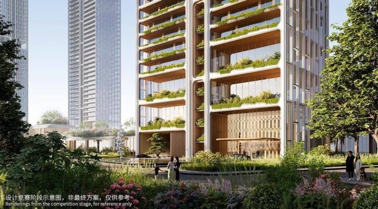 全玻璃幕墙+“竹韵”曲线立面:采用KPF建筑设计事务所方案,外立面以自然为灵感,通过垂直绿化与空中连廊系统形成“生态绿洲”,塔楼顶部规划直升机停机坪;