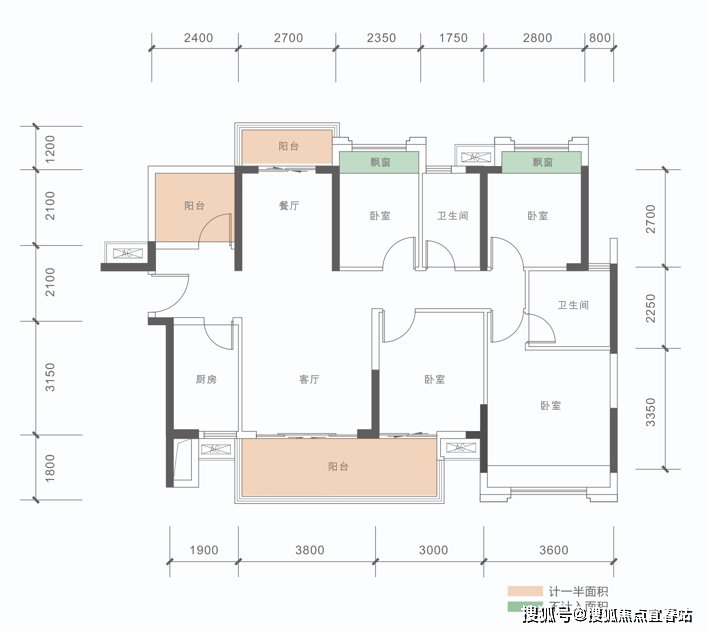 A户型: 86㎡(2+1房,2卫)同级面积稀缺双卫结构、三开间朝南