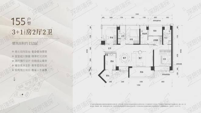 152㎡的4房2厅2卫,3栋2单元01户型,设计的是横厅南北通透格局,进门入户玄关,客餐厅7.7米开间,LDKB一体化设计,四开间朝南,4个卧室分别做到了主卧21.17㎡/次卧12.4㎡/次卧11.7㎡/次卧11.7㎡(包含墙体飘窗),客厅出5.1米长阳台,L型厨房带1个生活阳台,公卫三段式分离,得房率约90%(包含赠送),东南朝向。