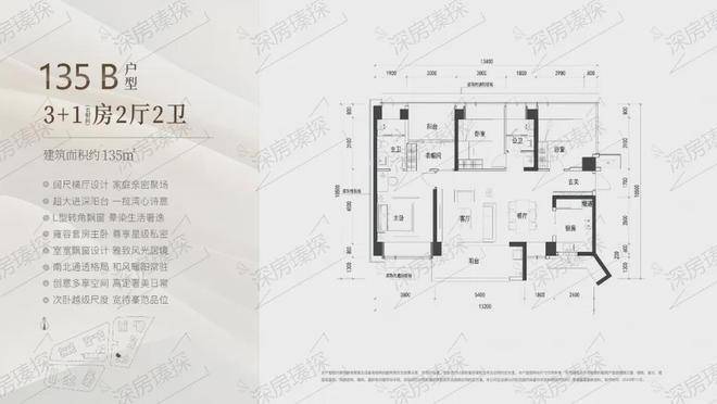 135㎡的4房2厅2卫,B户型(2栋4单元06户型),设计的是横厅南北通透格局,进门入户玄关,客餐厅7.2米开间,LDKB一体化设计,四开间朝南,4个卧室分别做到了主卧19.08㎡/次卧14.3㎡/次卧11.7㎡/次卧11.7㎡(包含墙体飘窗),客厅连接次卧出6.8米长的观景大阳台看深大校区,U型厨房,卫生间干湿分离,得房率约90%(包含赠送),阳台主朝西南向。
