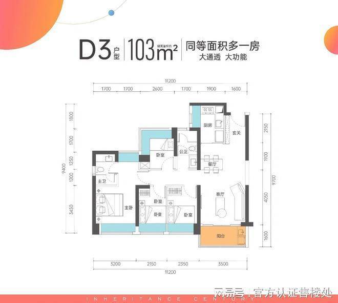 103㎡户型:或为100㎡的变体设计,横厅南北通透,客餐厅开间5.2米,全屋飘窗设计,强调空间灵活性。