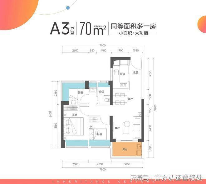 70㎡三房一卫:是项目最小面积段产品,主打高性价比。
