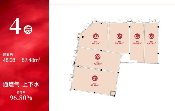 商铺使用率约96.8-97.7%、层高约5.4米,开间与进深比经过科学优化考量,格局方正、空间利用率高。