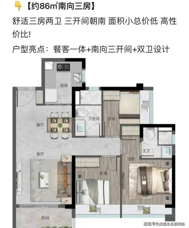 户型亮点:餐客一体+南向三开间+双卫设计