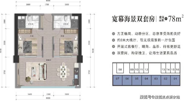 高层期房:约78㎡海景双主套房, 8米横厅宽幕,一线海景!