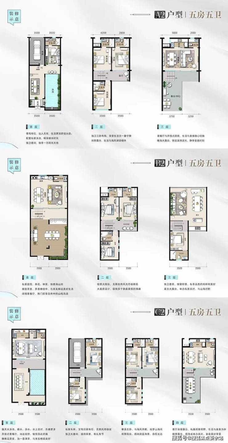 别墅小院:约80㎡海边小院,5房5卫套房设计,有天有地有院子和看海露台!