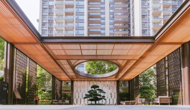 双层中空隔音的“中航特玻”,商业裙楼、广场、园林人行道全石材打造。