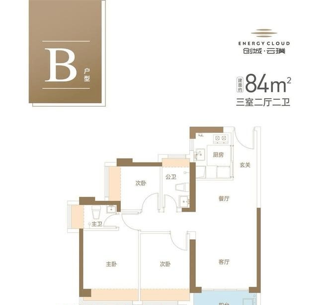格局设计:竖厅通透格局,客餐厅开间约3.6米,连接景观阳台,视野比69㎡更开阔;三房设计在有限面积内实现功能扩容,满足多人口居住需求。