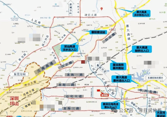 周边覆盖有厦深高铁惠州南站、深汕高速、惠深沿海高速、惠大高速可通达深圳、惠城、惠东等地。道路交通方面,北侧靠近大亚湾主干道中的龙海二路,西行直通坪山丹梓大道,北行转至新通车的东华大道快速通往惠阳淡水中心区,靠近规划中的14号线惠州站草洋站点。沿龙海二路东行转大亚湾大道可达大亚湾中心区及惠深沿海高速高速澳头入口。