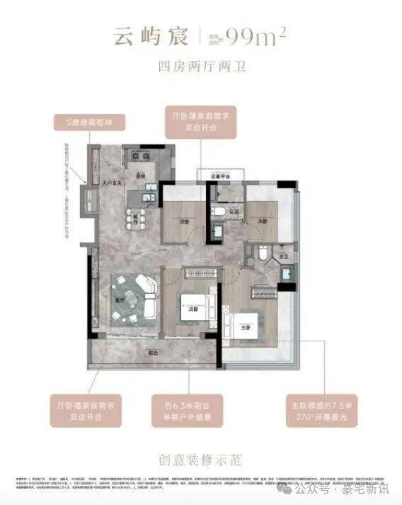 99㎡的4房2厅2卫,设计的是竖厅格局,客厅3.35米开间,LDKB一体化,S墙设计预留双开门冰箱卡槽位,三开间朝南,动静分区,分别做到了主卧15.26㎡/次卧9.57㎡/次卧6.96m²/次卧6.96㎡(包含墙体飘窗),U型厨房,公卫三段式干湿分离,赠送设备平台,得房率约78.27%(不含赠送),客厅连接次卧出9.37m²大阳台西南或东南朝向。靓点:99平做到了4房2卫,主卧270°无柱转角飘窗,厨房烟道外置+额外赠送设备平台,并且是纯南向格局。