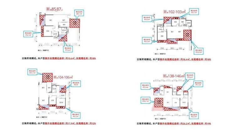 7、户型使用率 这个楼盘以户型得房率高出名,开发商有偷面积赠送,每一个户型交房的时候都有一个完整的房间赠送,另外还有一个房间以阳台报建以达到半赠送的效果,每一个房间全赠送的飘窗交房时都会打掉,以达到真正的使用面积。每个户型都有接近17-20平的赠送,拿87平举例,不仅可以做到3.8的客厅开间,还能做到双卫,主卧还能做到接近20方,不过87平户型餐厅略小,这点是扣分项。户型使用率这一项可以打9分。