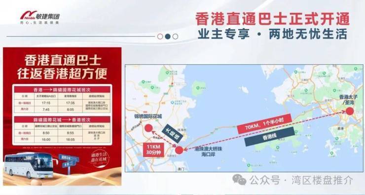社區內有公交總站,接駁珠海;項目距港珠澳大橋直線距離僅約10公里;距廣珠輕軌明珠站約9公里;家門口的快線——坦洲快線第一段工程已完工並通車,實現10分鐘達中山市區,;寶珠北路正式動工(林東小學至錦繡國際花城路段;錦繡國際花城多維立體交通,實現無障礙接駁中珠港澳,是大灣區西最核心的發展圈。