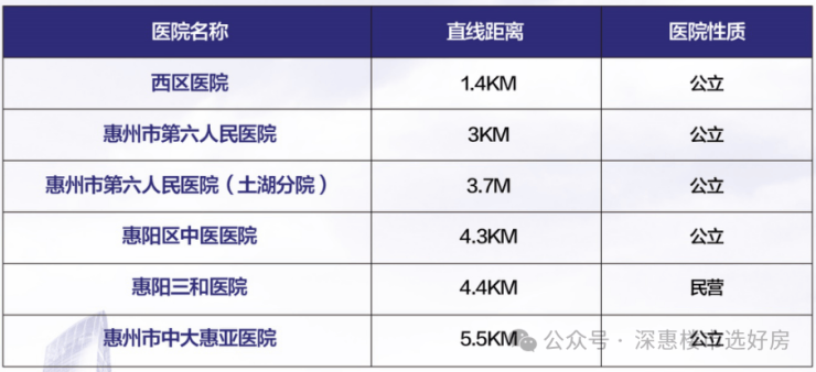 15分钟到达中大惠亚医院、惠州市第六人民医院,其中惠亚医院可使用深惠两地医保,6公里内6所中大型医院形成黄金保障圈。