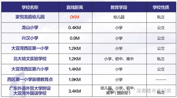 大亚湾为教育强区,9年义务教育+3年免费教育,并且社区自带幼儿园,5分钟到达大亚湾一小、大亚湾一中等公立学校,周边5公里范围内囊括大亚湾西区第三实验学校、大亚湾京师实验学校、博雅培文实验学校、广东外语外贸大学附设外国语学校等名校。