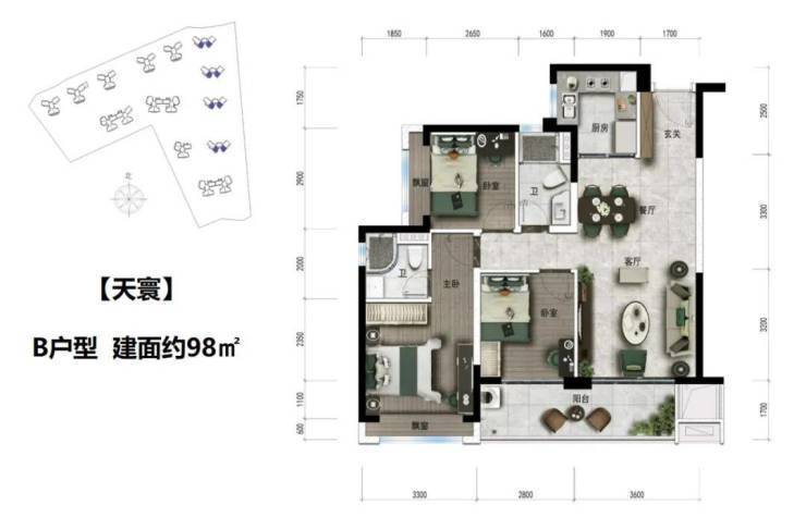 约98㎡的三房两卫,约5.7米阳台+主卧套房+U型明厨,空间感很足。