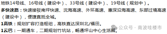 自带6万商业,10-15分钟到达坪山最出名的商业中心益田假日广场,吃喝玩乐一条龙全搞定,天虹商场,另外还有坪山首个万象城进驻(在建),官方公布计划在2025年开业运营,也是深圳第三座万象城,总占地面积30公顷,规划商业规模超12万平方米,其中集中商业9万平方米,街区商业3万平方米,该项目建成后将成为集购物,娱乐,文化,餐饮和社交于一体的城市综合体