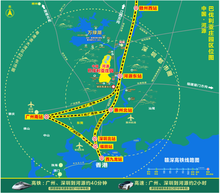 高铁(赣深高铁,广河及杭广高铁)、一轻轨(惠河城际轻轨)贯穿,巴伐利亚庄园将轻松融入广深港半小时生活圈