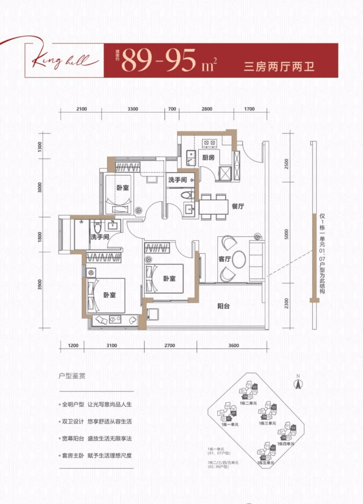 89㎡的3房2厅2卫,设计的是竖厅格局,LDKB一体化设计,客厅3.6米开间,进门独立玄关,客厅连接卧室出6.3米长的超大阳台,3个卧室分别做到了3.3米/3.1米/2.7米的宽度,U型厨房,有朝南向或朝东向。