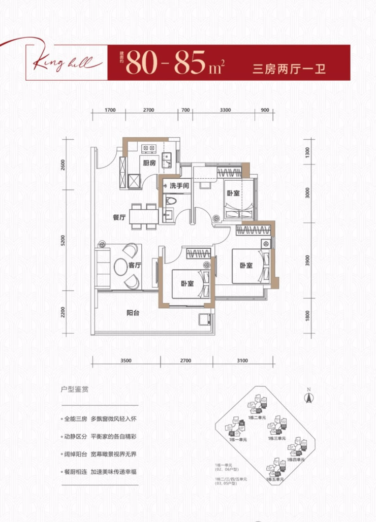 85㎡的3房2厅1卫,设计的是竖厅格局,LDKB一体化设计,客厅3.5米开间,进门独立玄关,客厅连接卧室出6.2米长的超大阳台,3个卧室分别做到了3.1米/3米/2.7米的宽度,U型厨房,有朝南向或朝东向。