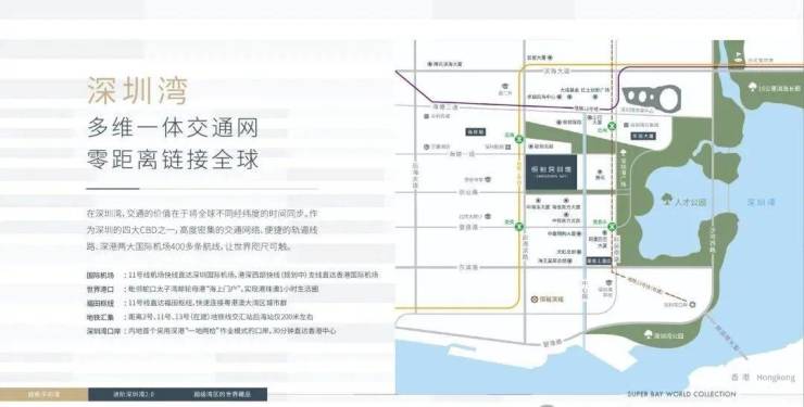 交通方面:恒裕深圳湾项目距离2号、11号地铁线交汇站后海站不远,可通过11号线直达福田枢纽,快速连接粤港澳大湾区城市群,同时11号线是机场快线,可直达深圳国际机场,还有港深西部快线支线直达香港国际机场。