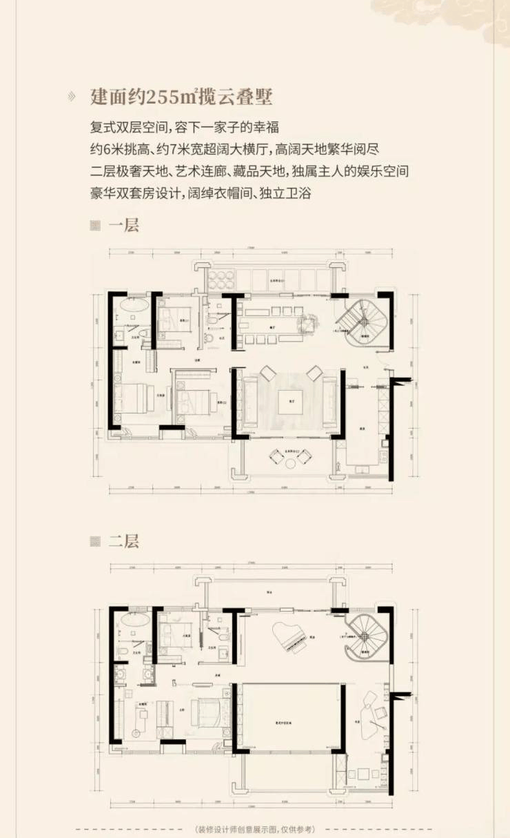 建面约440-837㎡国风院墅(总价约800万-2500万/套),建面约239-255㎡揽云叠墅(总价约500万-600万/套)