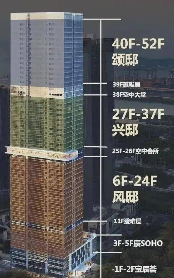 华侨城宝辰总高230米,为宝中最高楼;项目52层,分为中区、高区、超高区,6层起卖,11、39F为避难层,25-26F为空中会所,28F为空中大堂。除了空中大堂项目还有地下入库大堂+首层大堂,一共三重大堂。